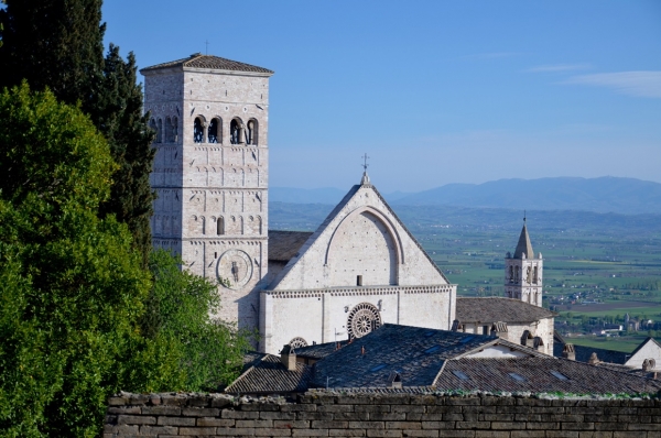 Prace przy budowie Bazyliki św. Franciszka rozpoczęto w 1228 r., dzień po jego kanonizacji. Budowa kościoła dolnego trwała dwa lata i w niej złożono ciało świętego. W 1239 r. zakończono wznoszenie bazyliki, konwentu i dzwonnicy. Gotycko-romański kościół zaprojektował zakonnik i architekt Eliasz Bonbarone. Upiększanie trwało wiele lat. W 1253 r., przed konsekracją bazyliki, zakończono je w kościele dolnym. Jego najważniejszym miejscem jest Kaplica Grobu św. Franciszka. Kolumnę - grobowiec otaczają umieszczone w niszach groby pierwszych czterech braci zakonu św. Franciszka, błogosławionych Leona, Masseo, Anioła i Rufina. Oprócz niej podziwiać można kaplice: św. Marcina, św. Stanisława Szczepanowskiego, św. Jana Chrzciciela, św. Szczepana, św. Wawrzyńca, św. Antoniego z Padwy, św. Marii Magdaleny i św. Mikołaja z Bari. Kościół zdobiony jest licznymi freskami autorstwa: mistrza szkoły pizańskiej - Pisano, florenckiej - Cimabue, Giotto, rzymskiej - Torriti, Cavallini, Rusuti oraz sieneńskiej - Lorenzetti i Martini. Rozbudowa bazyliki miała miejsce w XIV i XV wieku. Ostateczny kształt został nadany w latach 1474 - 1476. 25 marca 1754 roku papież Benedykt XIV nadał jej tytuł bazyliki patriarchalnej oraz kaplicy papieskiej. Podnosząc do godności bazyliki większej, jednocześnie włączył ją do grona świątyń o największej randze w całym Kościele. Jest ona też najważniejszym kościołem franciszkańskim. Stanowi symbol jedności rodziny franciszkańskiej, do której należą trzy zakony: franciszkanie, klaryski i franciszkanie świeccy. 8 września 1997 r. trzęsienie ziemi poważnie uszkodziło bazylikę.